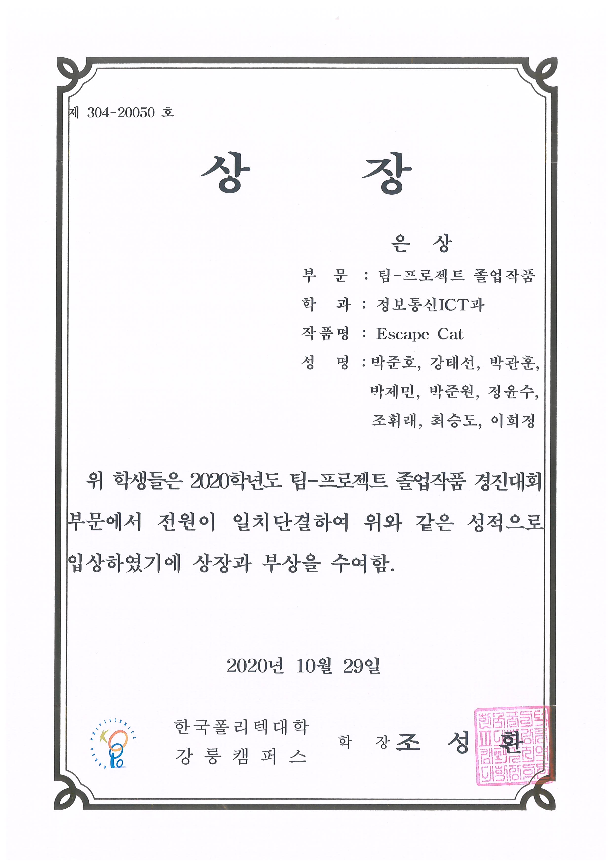 저희과의 한팀이 2020학년도 팀-프로젝트 졸업작품 경진대회에서 은상을 차지 하였습니다.